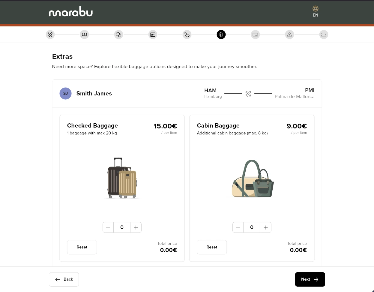 云购物——由Ink Innovation为Marabu开发的在线值机服务,现已支持乘客在抵达机场前办理行李托运及额外服务,并可通过银行卡或移动钱包完成支付。